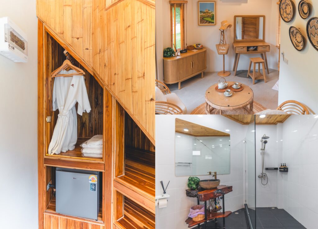 มีโต๊ะเครื่องแป้ง มินิบาร์ ตู้เย็น ตู้เสื้อผ้าและห้องน้ำ